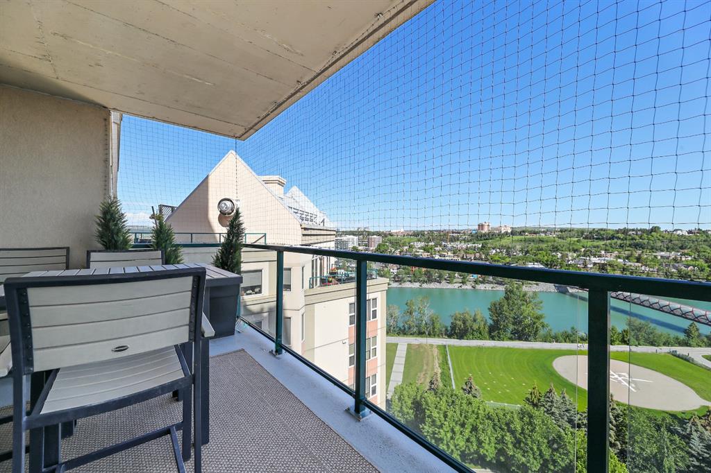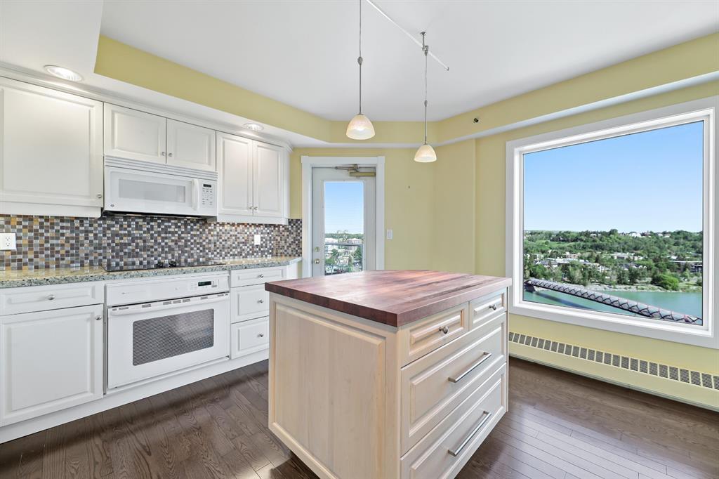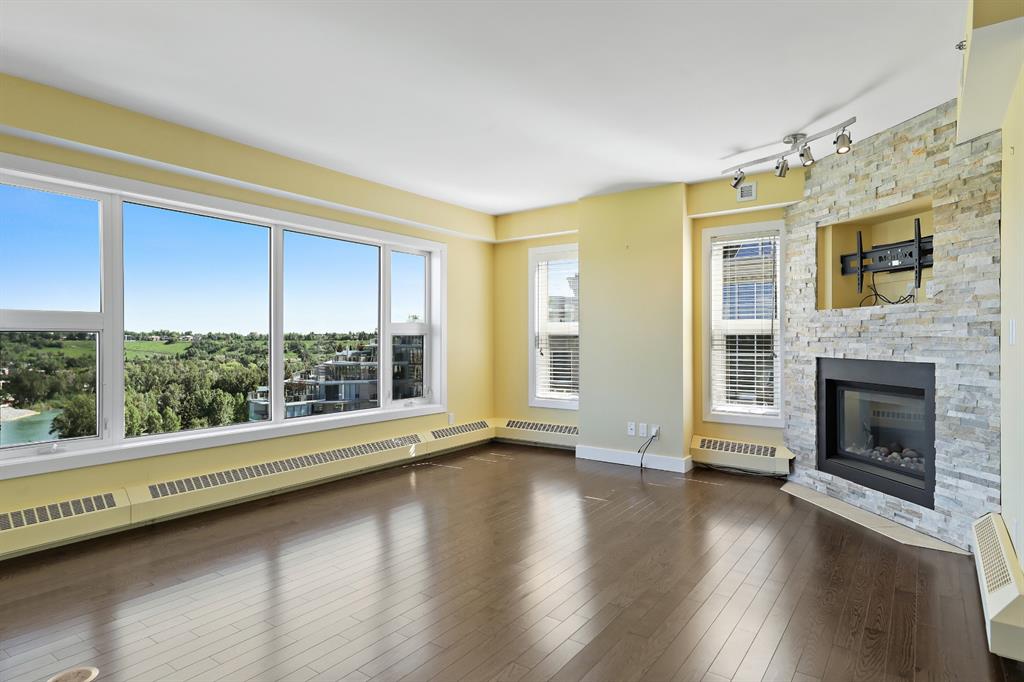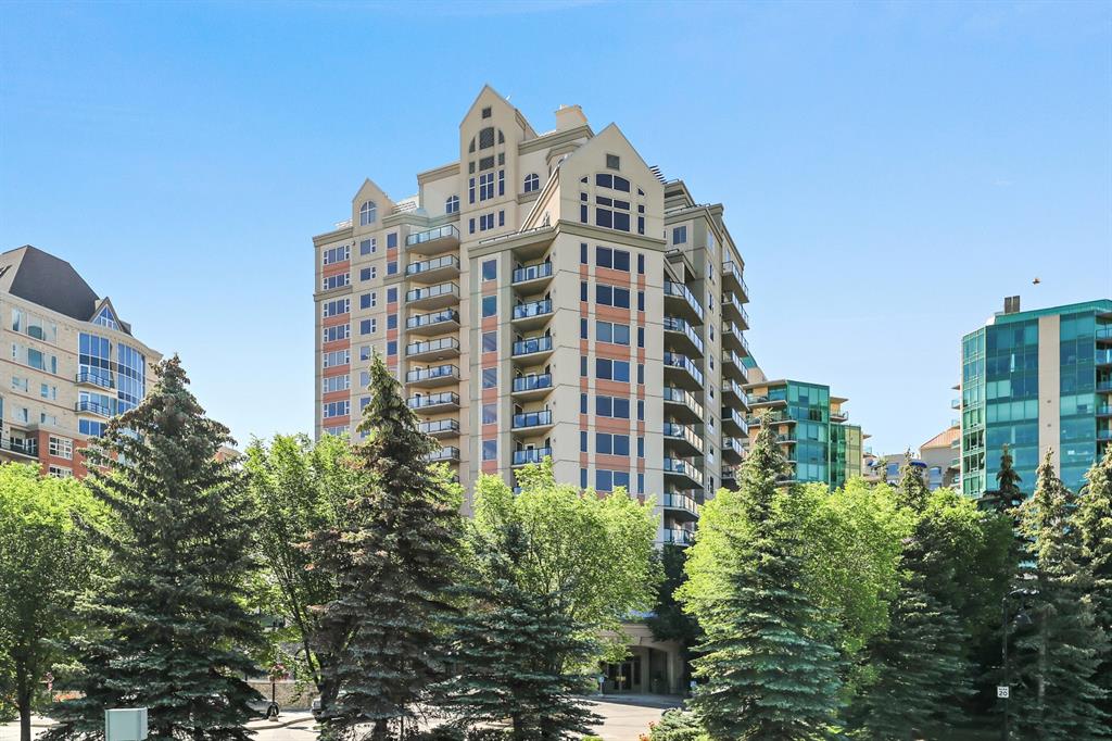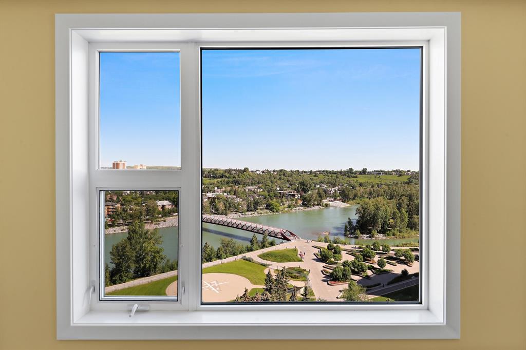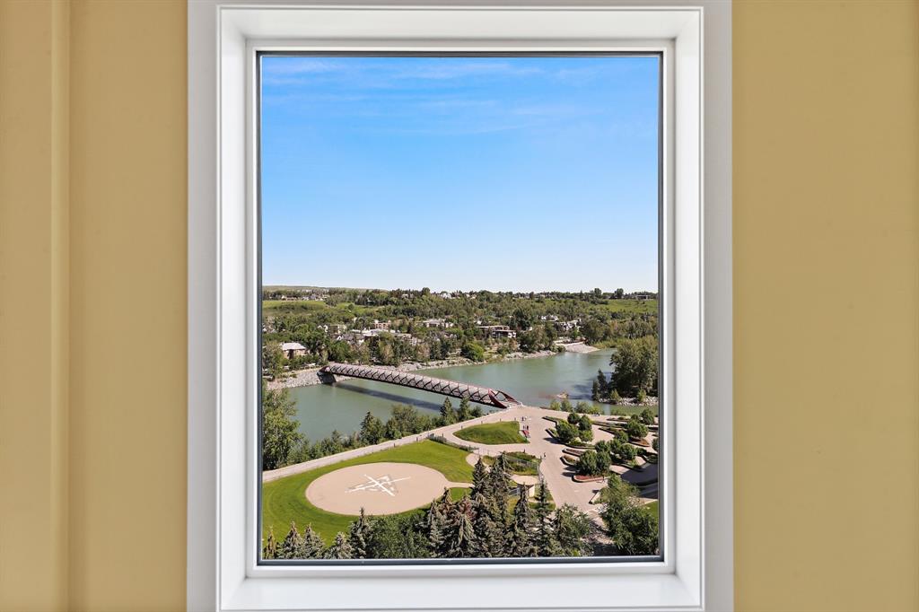 Luxury condo living at it’s finest! Extraordinary northeast corner location with spectacular 14th floor views of the Bow River, Peace Bridge, Parks and City! This upgraded gem has a very entertaining open floor plan with large picturesque windows that provide plenty of natural light while enhancing the great views from every room! This one has it all with 2 bedrooms, Den/Flex area, 2 balconies, 2 bathrooms, 2 titled parking stalls, titled storage locker, central air conditioning, gorgeous hardwood flooring throughout, stone facing gas fireplace, large separate laundry room with storage, new high end washer/dryer and spacious tile entrance way to greet guests. Beautiful open chef style kitchen with center Island, large pass-thru to dining area, new fridge, granite counter tops, tasteful back splash and quick access to the large covered balcony with stunning views! Spacious Primary bedroom has bright southeast corner windows with city views, large walk-in closet, 5 pce enuite bathroom with shower stall, double sink vanity and large soaker tub to relax in! Guest bedroom has built-in murphy bed with a city view, 2nd covered balcony has bbq gas line and owner has installed screen protectors on both balconies to keep them clean and meticulous, but they can also be taken down very easily. Home is vacant for a quick possession but seller is flexible! The Chateau La Caille is an elegant and luxurious building with quiet full concrete construction, welcoming concierge service, beautiful Grand entrance lobby with comfortable seating areas & fireplace, underground car wash bay and is located on a quiet no-thru traffic cul-de-sac in West Eau Claire. The location is exceptional with close proximity to the amazing upgraded walking/biking/jogging pathway system, beautiful Prince’s Island Park, Bow River and Lagoon, Peace Bridge, Eau Claire Market Shops, Cinemas, many fine Restaurants and Cafés, Plus 15 Skywalk System, LRT & Transportation and just a short walk to Kensington Shops, Safeway and Calgary’s vibrant city center. This incredible lifestyle and ultimate downtown urban living can be yours! Call for your private viewing today!